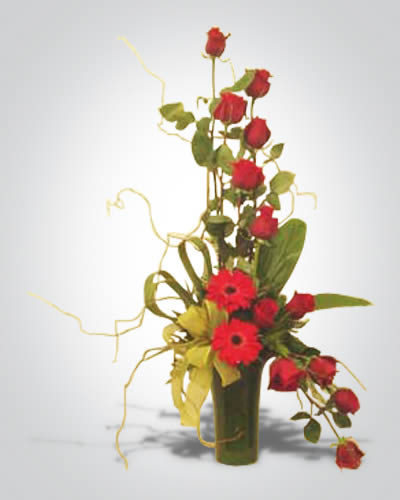 Regale esta hermosa composición floral de doce rosas y gerberas adornadas con follaje tropical y sauce retorcido, en un florero de vidrio.